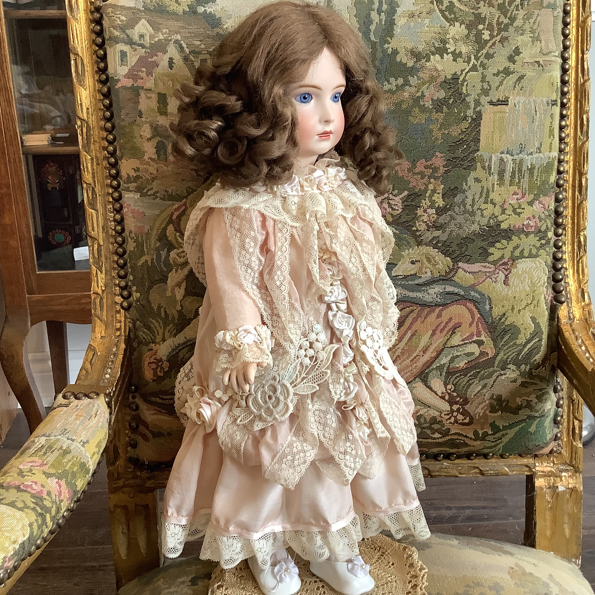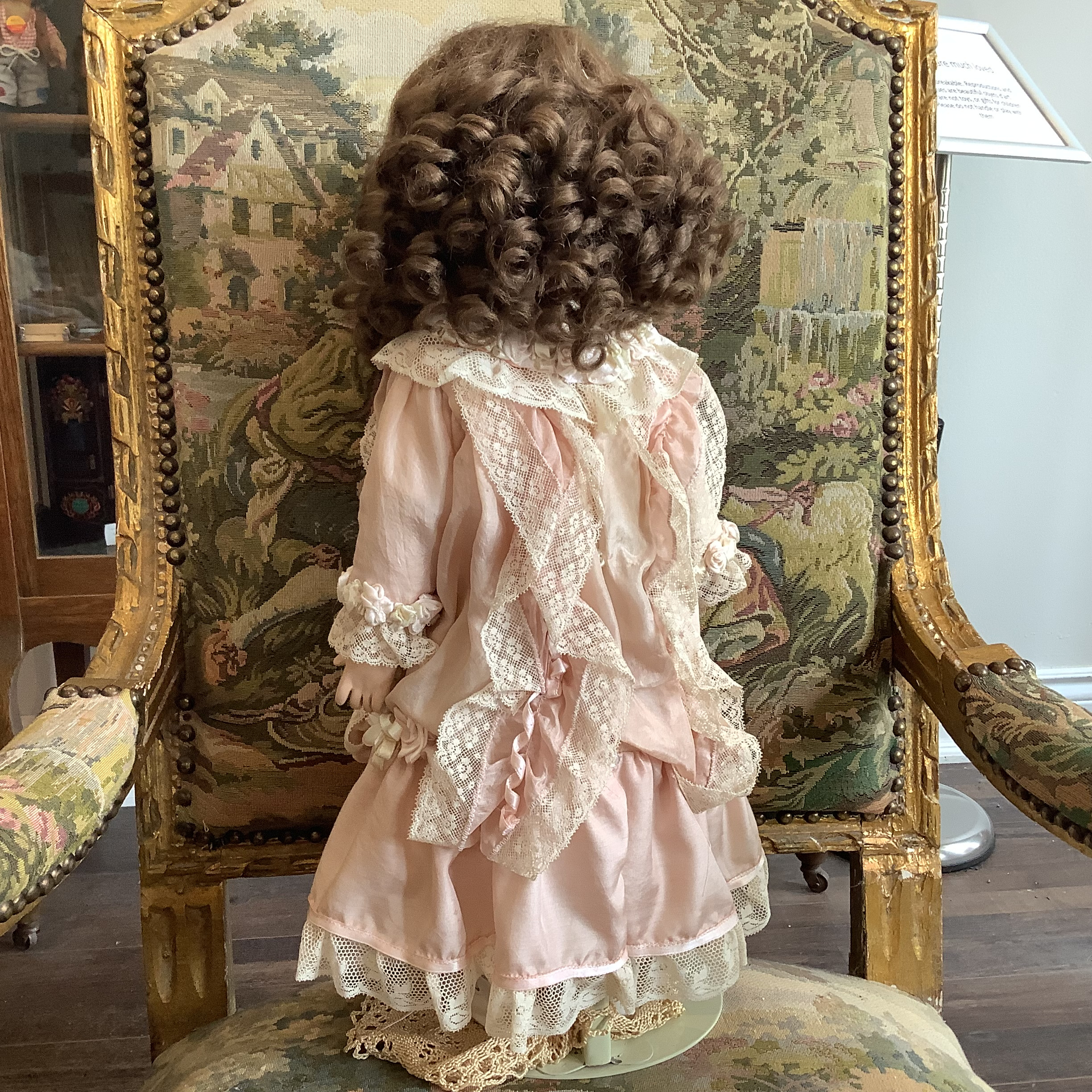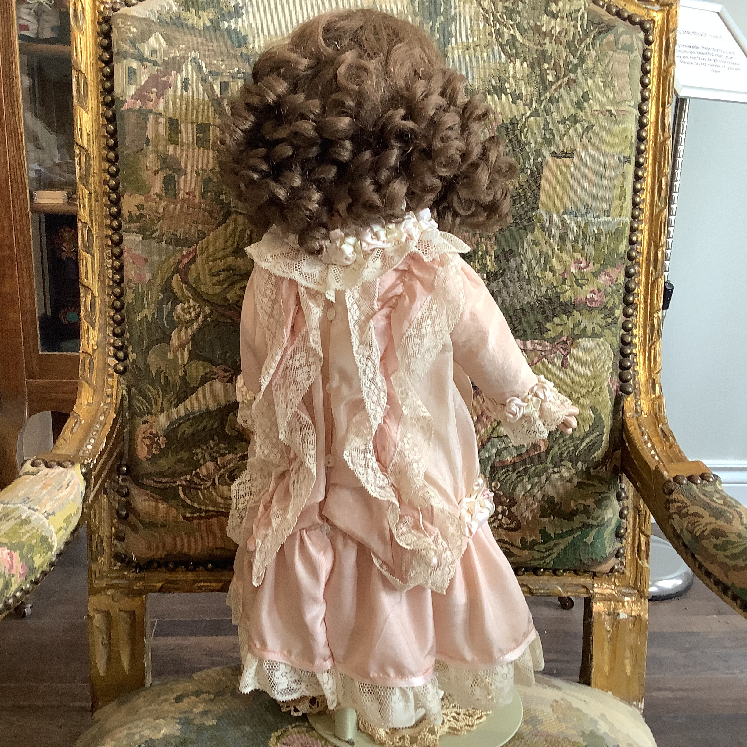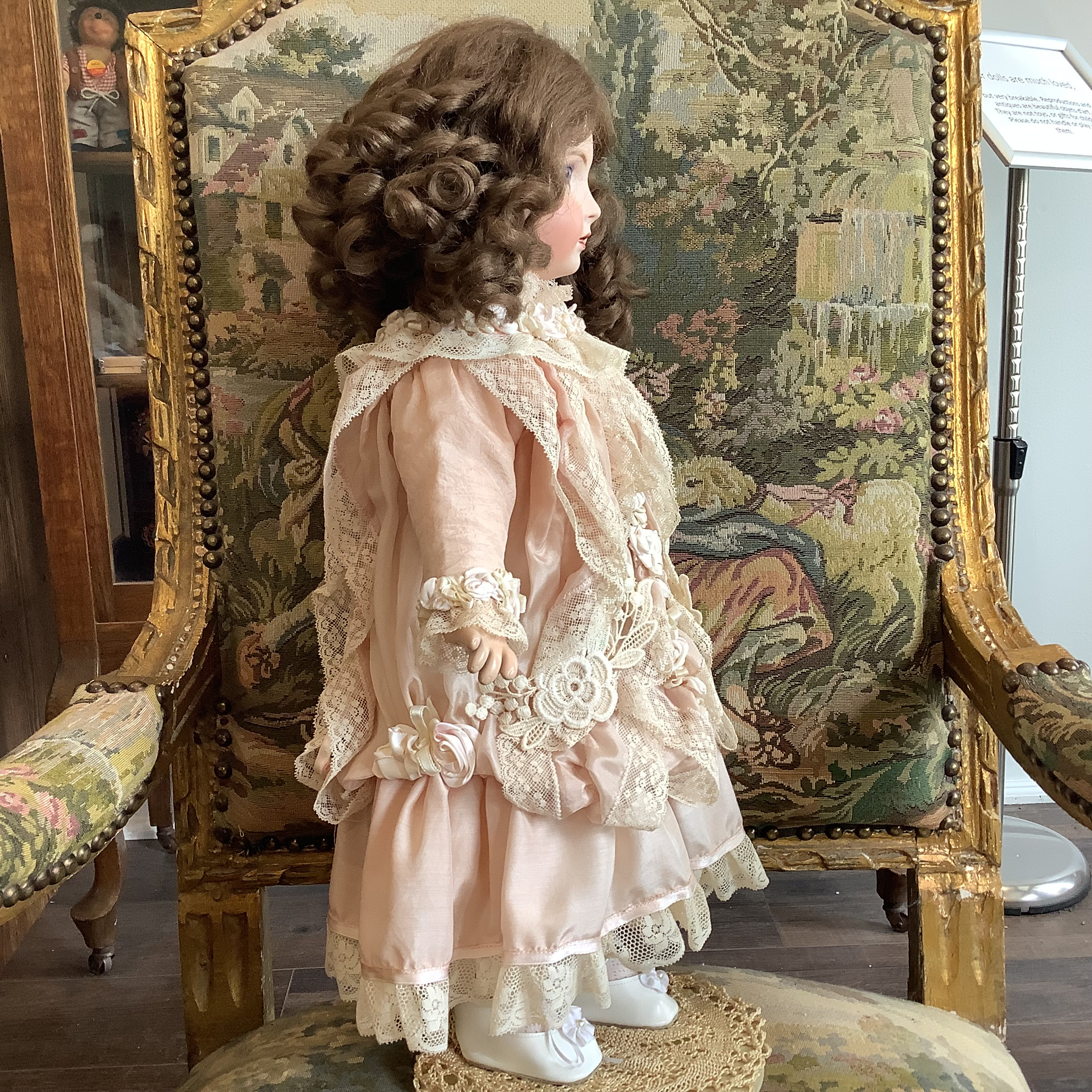 This sweet little girl charms all comers in her lace-drenched peach dress. 20” with brown hair curled at ends.