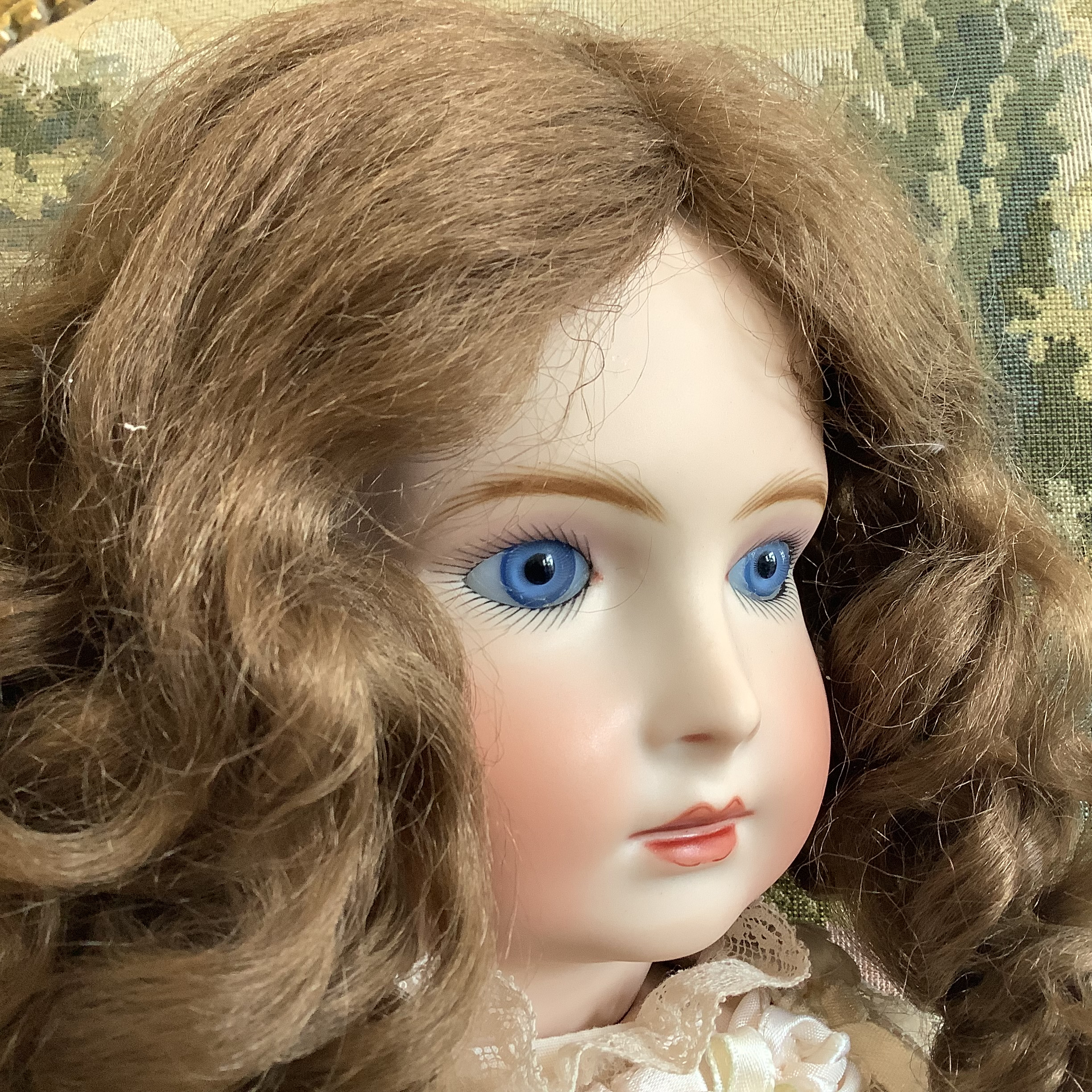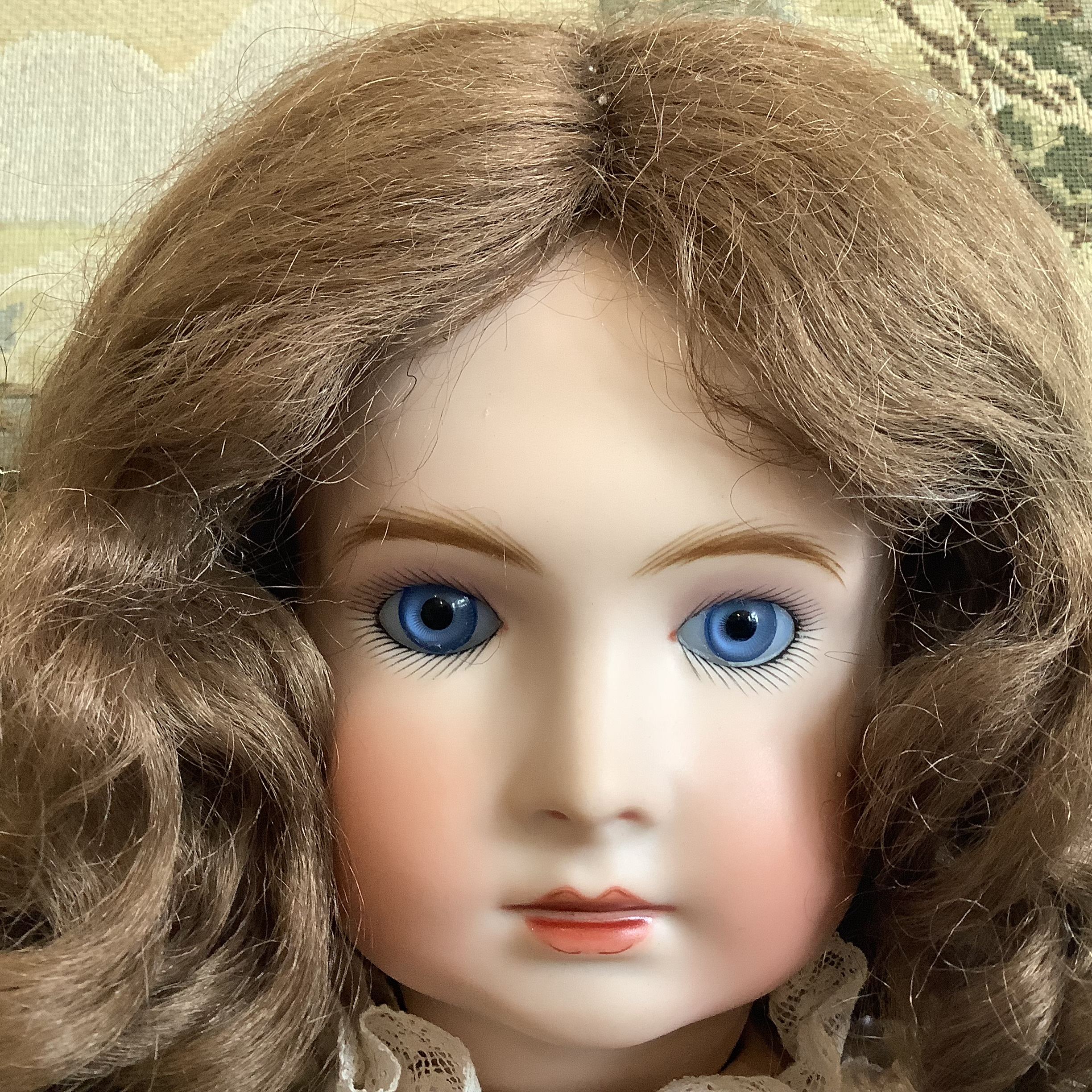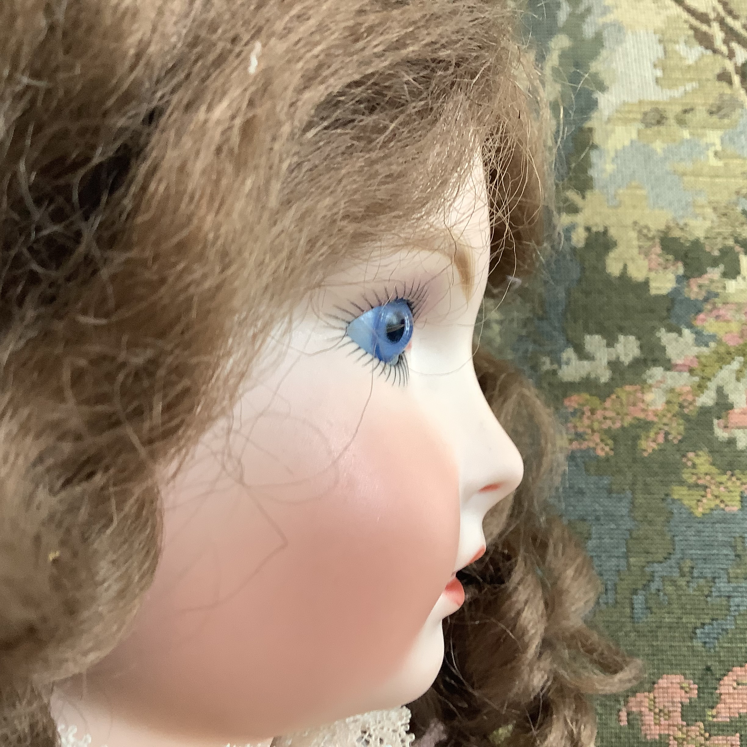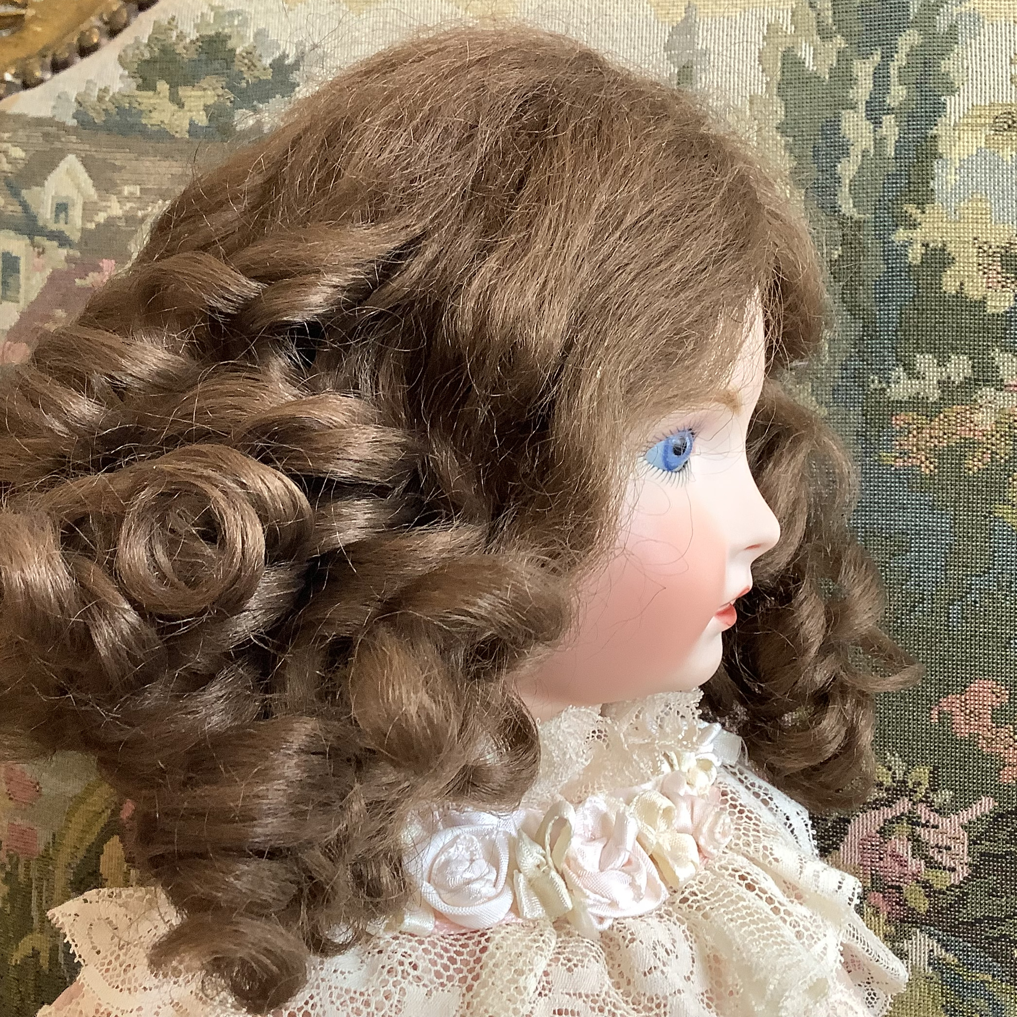 This sweet little girl charms all comers in her lace-drenched peach dress. 20” with brown hair curled at ends.